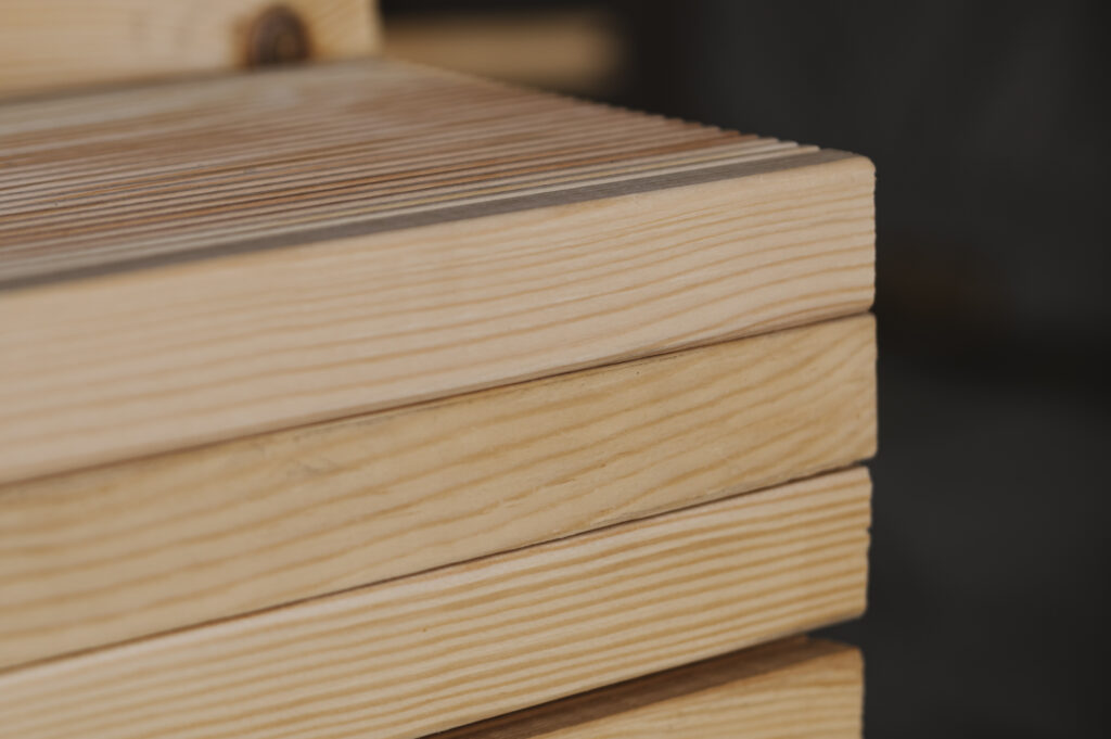Deski tarasowe sosnowe ryflowane obustronnie.